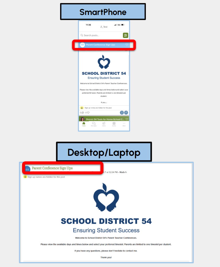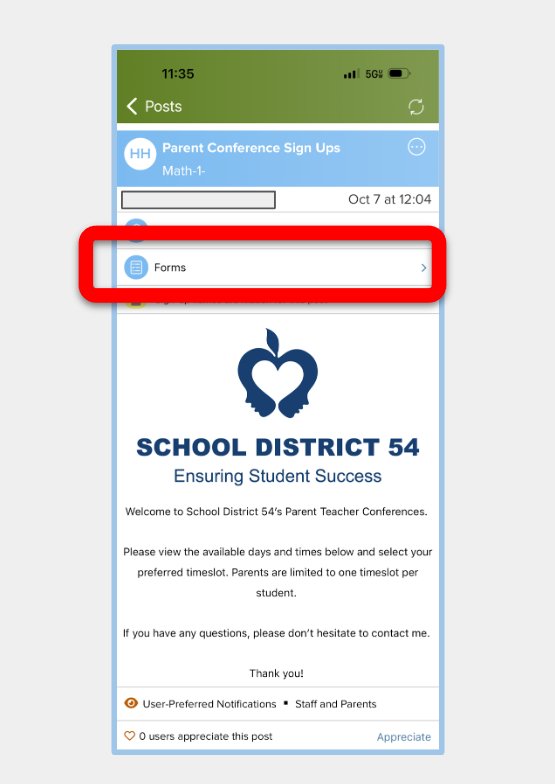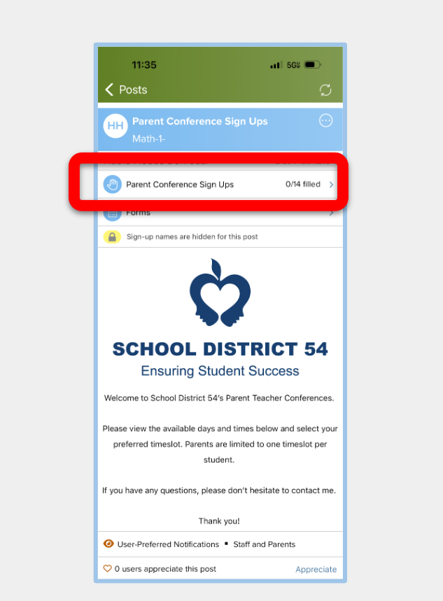 Please login to your ParentSquare App or on the website and look for the Parent Conference post sent by the teacher and click into the post.
